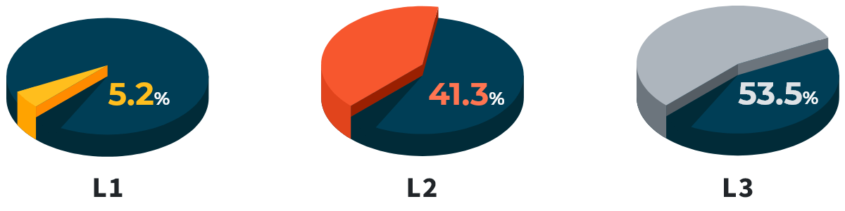 113年度通過行動應用App基本資安檢測基準App共計1507件,通過L1共78件(佔比5.2%)、L2共623件(佔比41.3%)、L3共806件(佔比53.5%)為大宗。